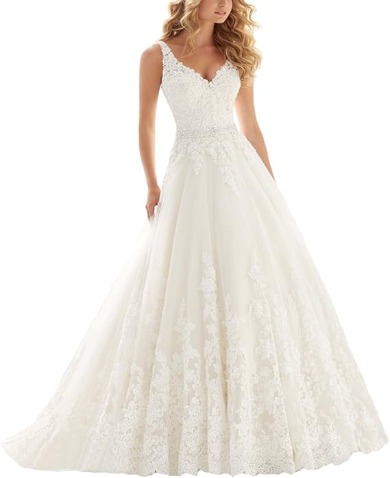 Beaded Straps V Neck Lace A Line Wedding Dress Brydealo