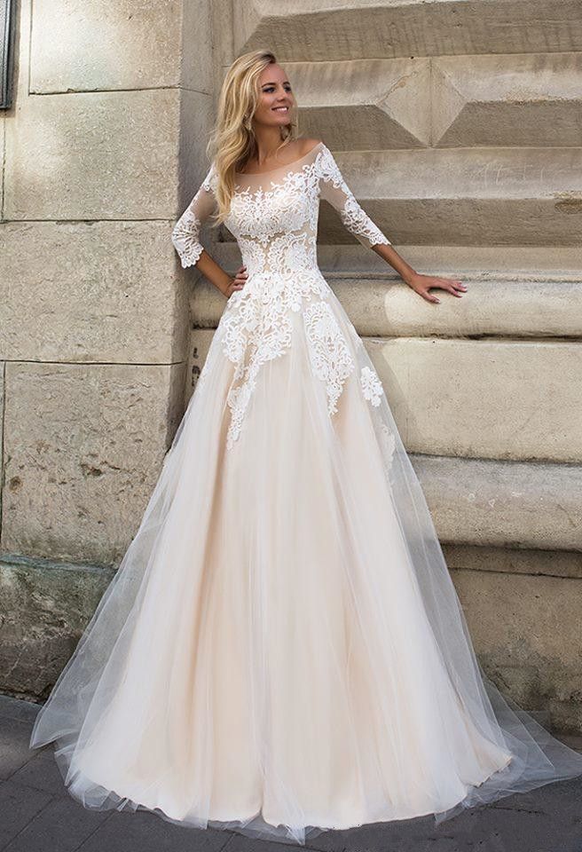 Discount Champagne Ivory A Line Wedding Dresses Vintage 3 4 Long