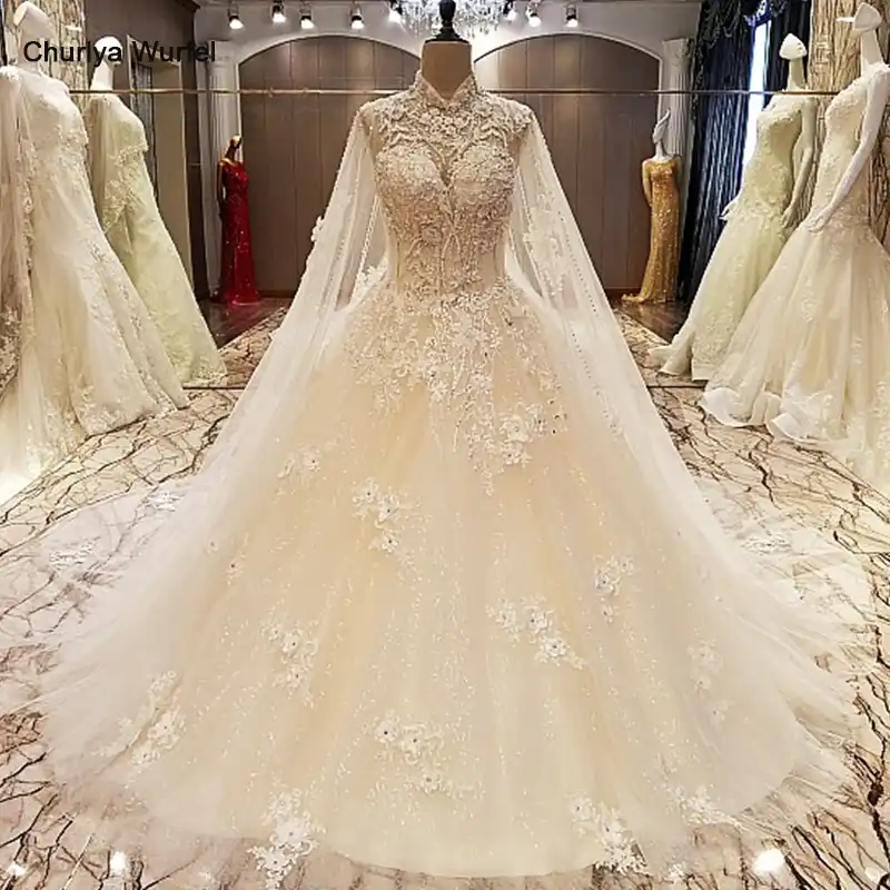 Long Sleeves Crystal Glamorous Lace Princess Wedding Dresses